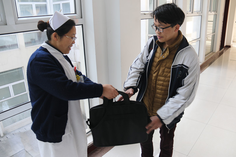 原来,这名学生名叫何海洋,是致远中学高三学生。2月13日下午在我院高考体检时,不慎将一个手提包和一背包遗落在座椅上。孙传梅看到包后,就连忙开始寻找失主,遗憾的是经过一番询问后还是没能找到失主。于是孙传梅将包拿到门诊服务台并打开包,发现内有笔记本电脑、衣物以及两名同学的高考体检单,体检单丢失将影响高考。眼看就要下班,可迟迟没有人来认领,为确保两个包的安全,孙传梅将包交到了保卫科吴建民的手中并请他妥善保管。体检结束回到学校后的何海洋这才发现到自己的包丢了,遂又来到我院门诊服务台,服务台护士孙传梅将两个包完好无损的交给了失主。小何见自己的包失而复得,格外感激,于是出现了开头的一幕。