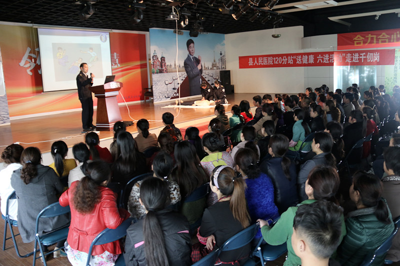 4月12日下午,我院急诊科主任于剑凤、护士长佴晓莉、120分站负责人陈湘等6名医护人员到泗阳县千仞岗服饰有限公司开展 “送健康六进”活动,受到了大家的热烈欢迎。