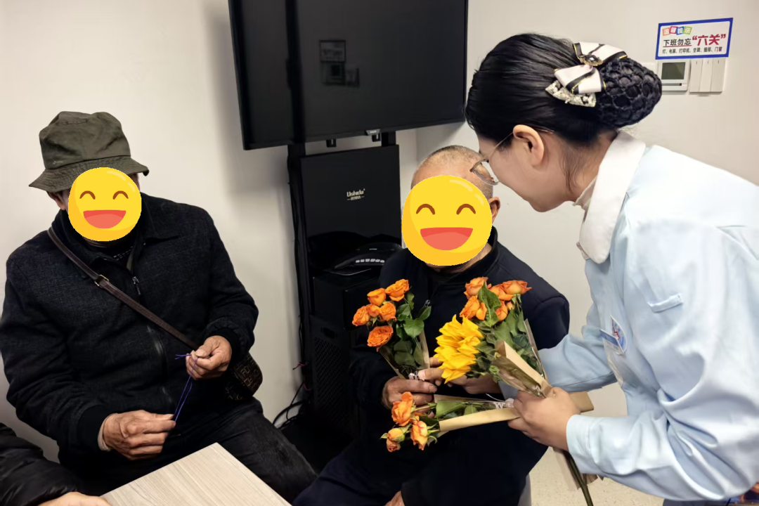 活动尾声,进入“四道人生中道爱”环节,护士与社工亲手为每一位患者及家属送上鲜花,传递医院的关怀与祝福;随后,患者们也手持鲜花,郑重地送到陪伴自己的家属手中,一句句简单的感谢、一个个温暖的拥抱,将现场氛围推向高潮,也让爱与陪伴在彼此心间传递。